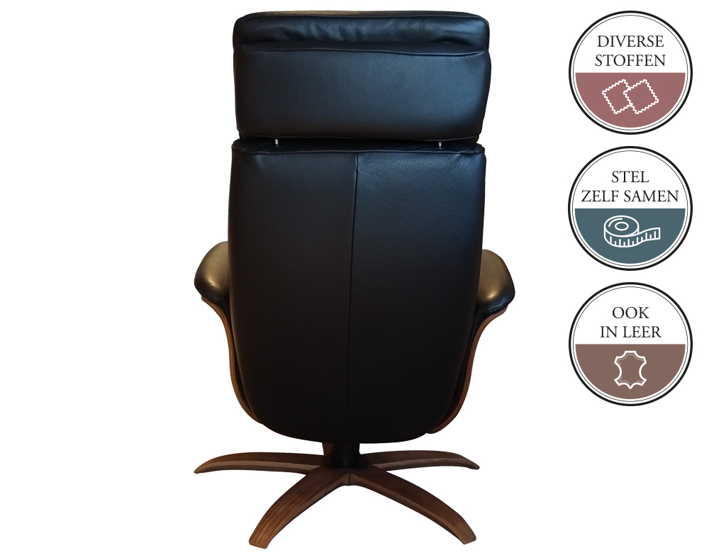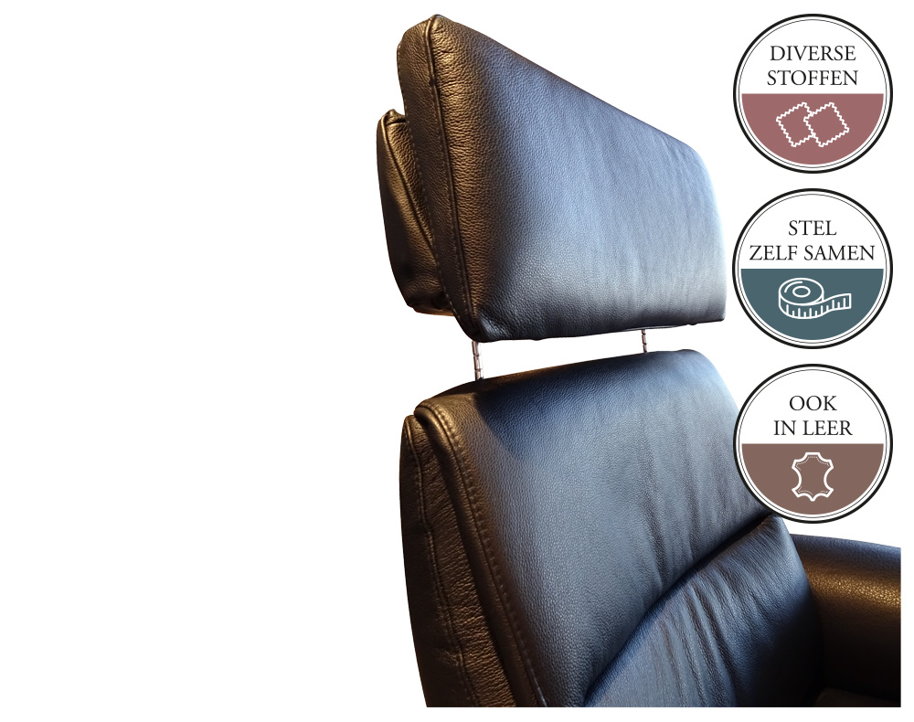 De houten zijkant is in diverse kleuren te bestellen. Het is ook mogelijk de houten zijkant mee te laten stofferen in dezelfde stof of leer keuze waarin je de relaxfauteuil bestelt. Je kunt de zijkant laten voorzien van een hendel, in het zwart of geborsteld. Uiteraard kan je de hendel ook achterwege laten.