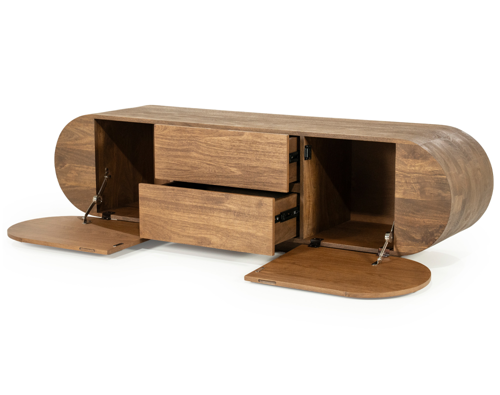 Het LISSABON Woonprogramma bestaat uit een dichte kast (Kabinet), twee afmetingen TV-Meubels en er is ook een salontafel te verkrijgen. De items zijn uitgevoerd in Mango hout en fineer, geborsteld. Het TV-Meubel op 160 cm breed is uitgevoerd met 2 deuren en 2 laden. De vakken zijn 33 x 36,5 cm.