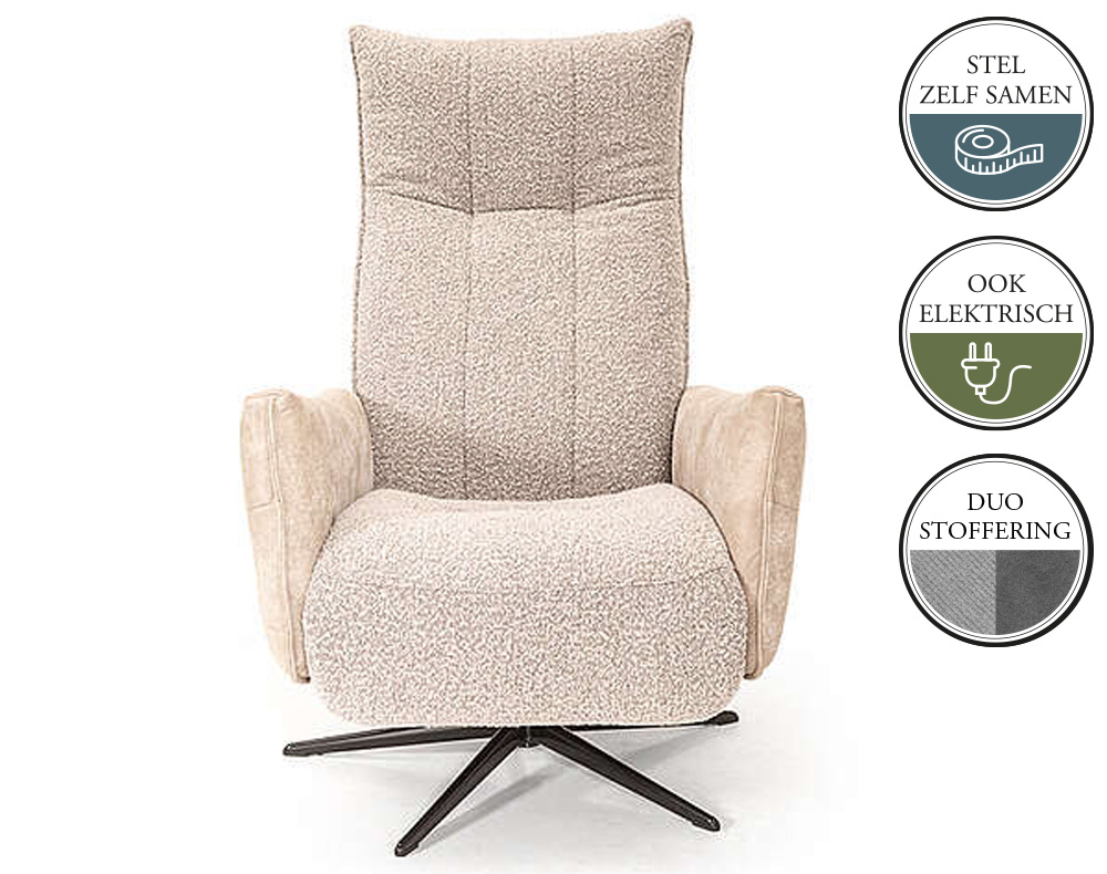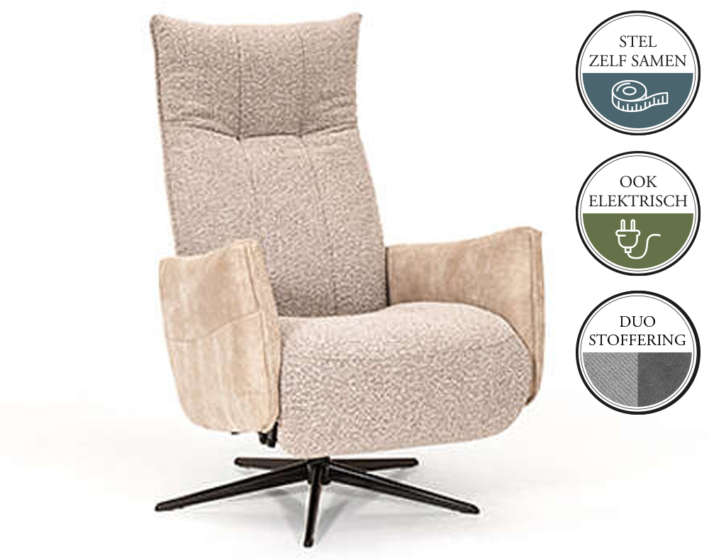 Verder kan je kiezen uit allerlei voeten van zowel metaal als hout. Bij een aantal voeten is het zelfs mogelijk een gaslift te bestellen! Wil je toch liever de fauteuil in één kleur, kies dan bij de stap duo stoffering voor nee. De hele fauteuil is dan in dezelfde stof, leerkwaliteit en kleur uitgevoerd.