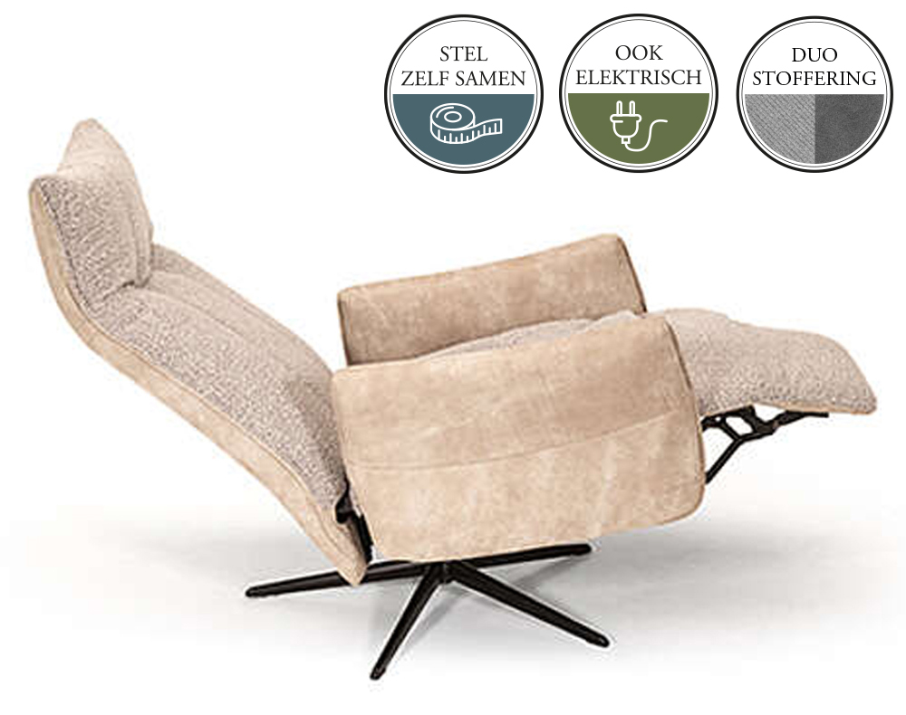 Deze relaxfauteuil is zowel manueel als elektrisch verstelbaar mogelijk. Mocht je voor de elektrische variant kiezen dan er een accu leverbaar. Als je een accu bestelt, dan wordt de fauteuil niet uitgevoerd met een snoer.