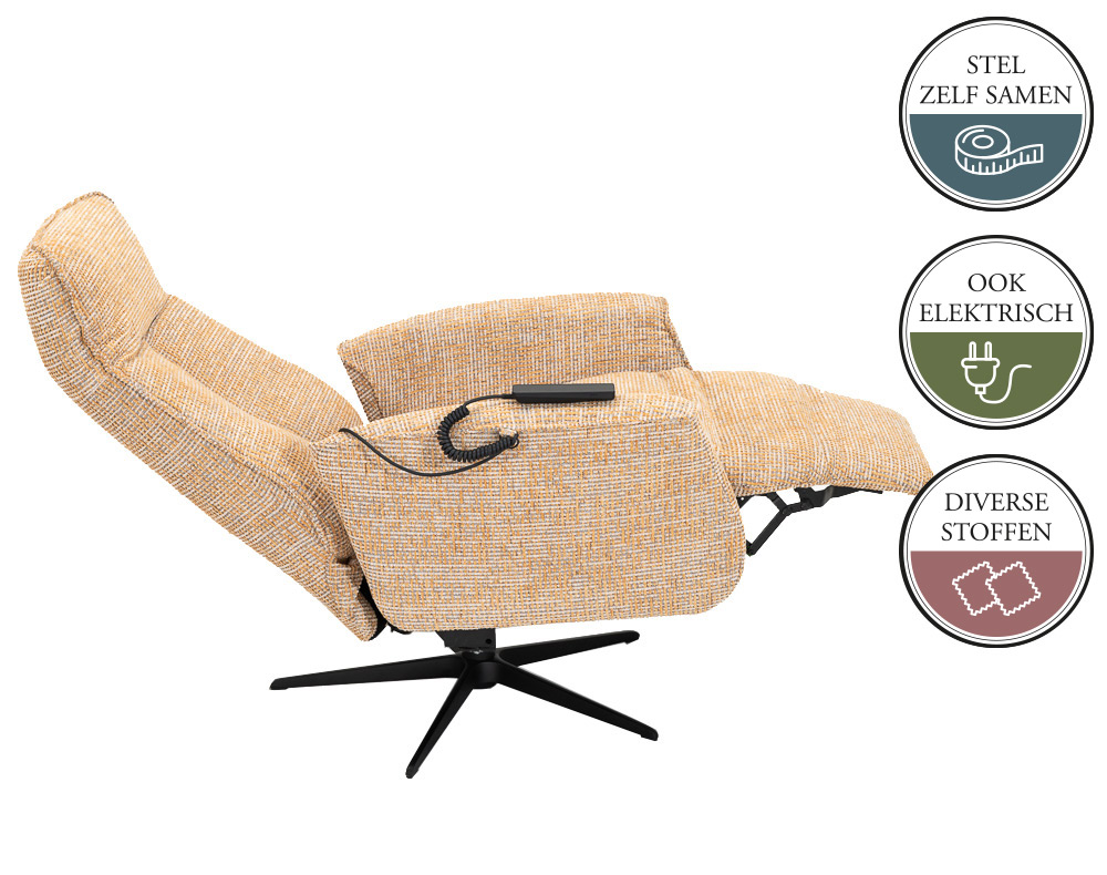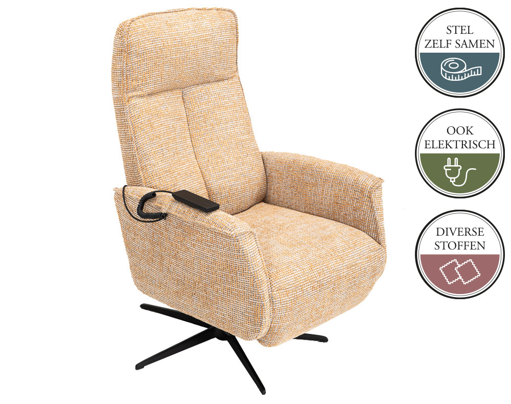 Elektrisch: uitgevoerd met drie motoren t.b.v. het aanpassen van de voetensteun, rugleuning en hoofdsteun. Het controlepaneel dat altijd op de rechter buitenkant (voorstaand links) van de relaxfauteuil wordt geplaatst is in twee kleuren leverbaar zwart of geborsteld. Mocht je voor de elektrische variant kiezen dan is er een accu leverbaar.
