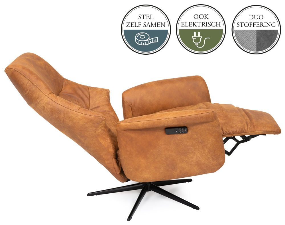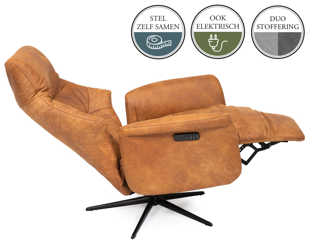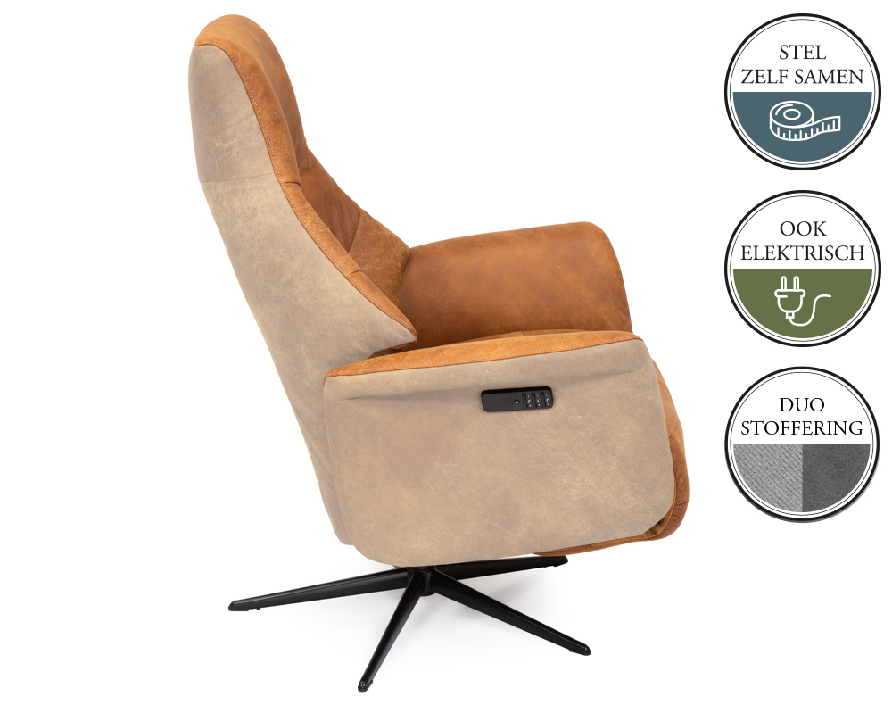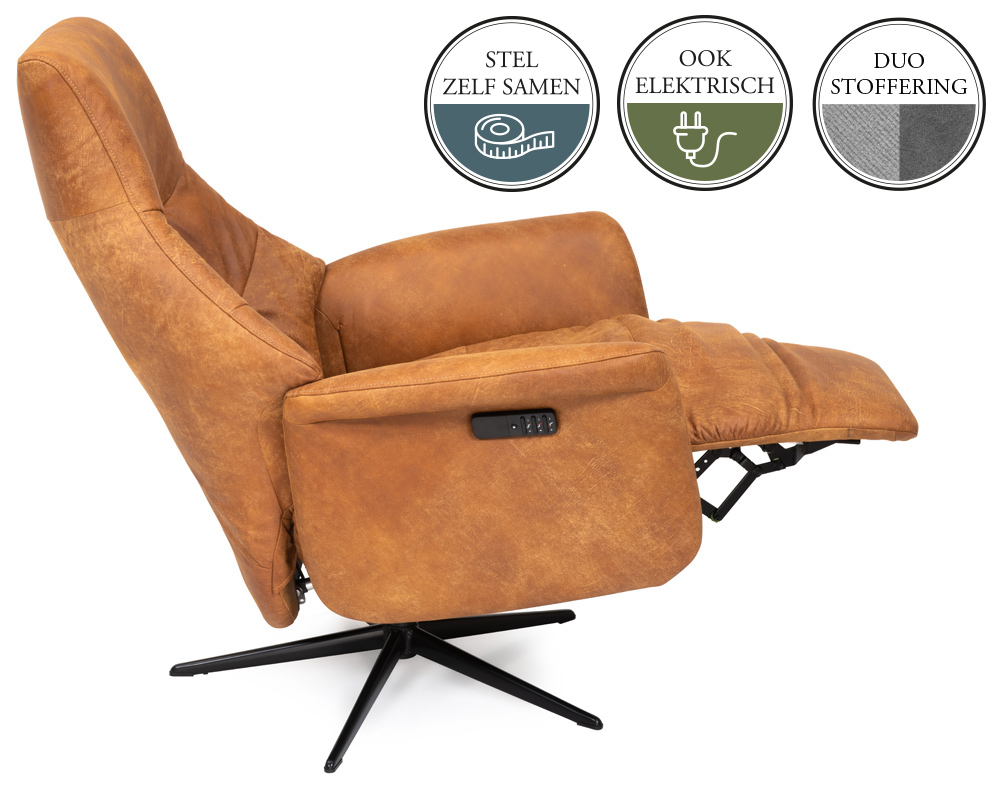 Deze relaxfauteuil is zowel manueel als elektrisch verstelbaar mogelijk. Mocht je voor de elektrische variant kiezen dan er een accu leverbaar. Als je een accu bestelt, dan wordt de fauteuil niet uitgevoerd met een snoer.