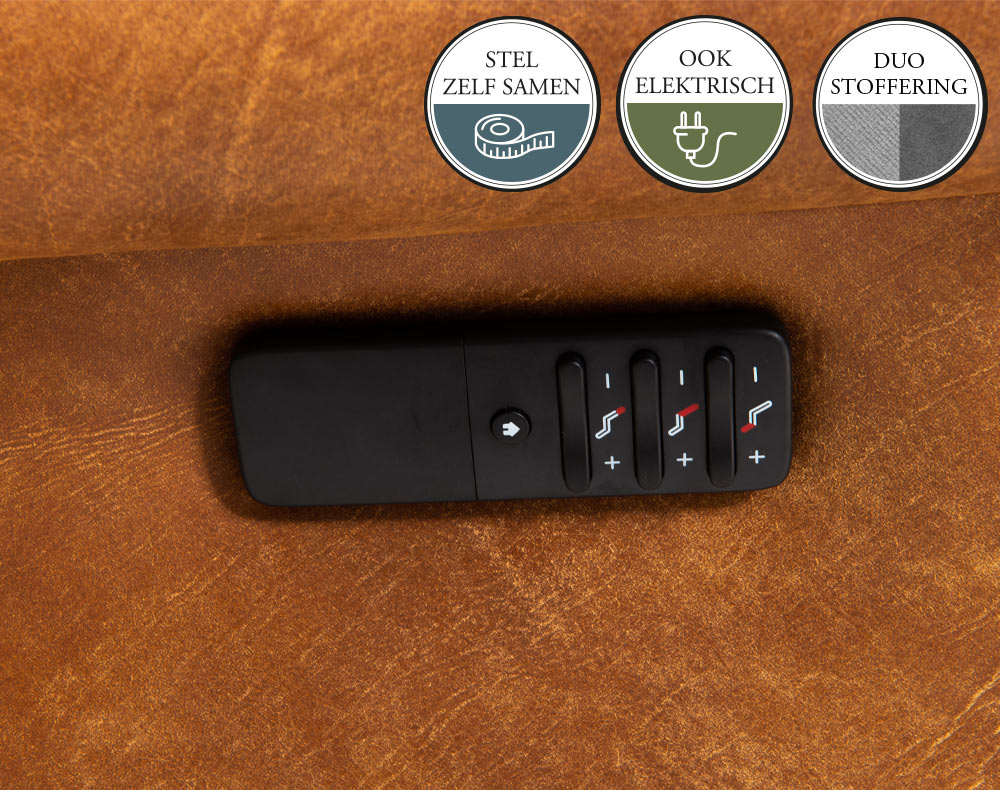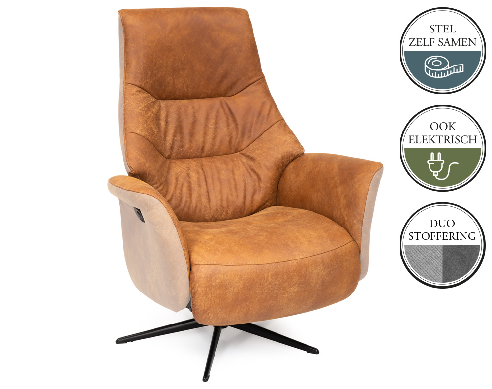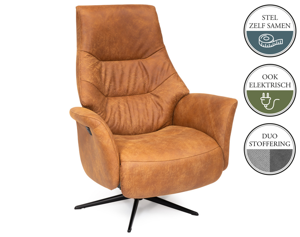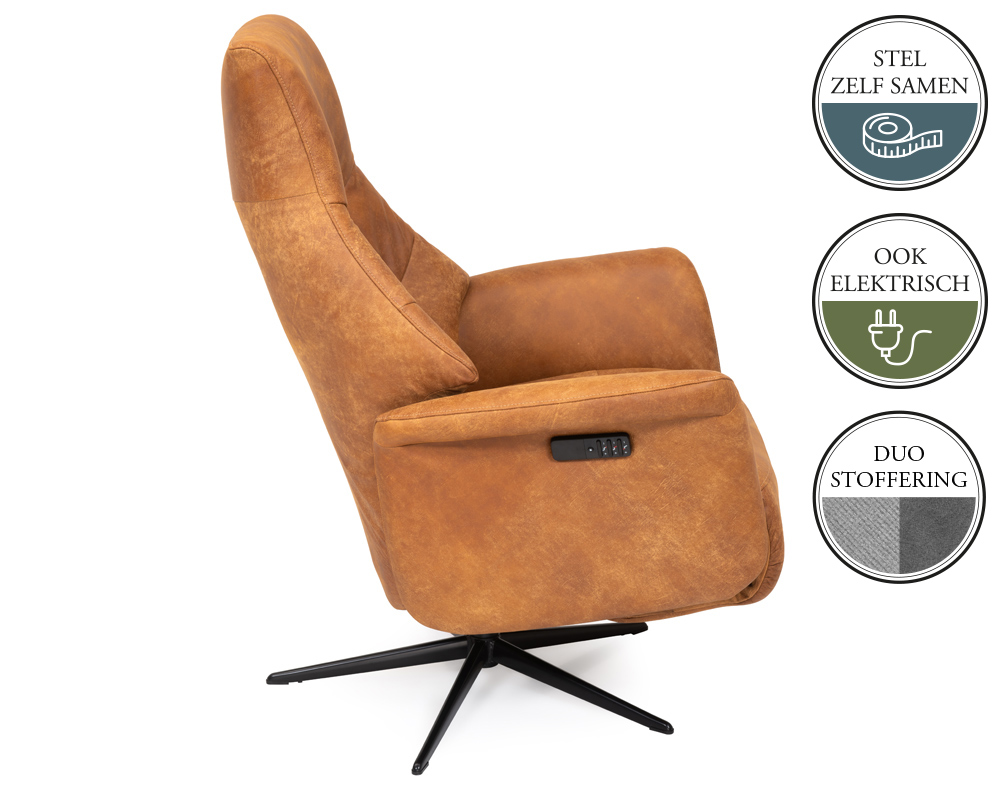 Deze relaxfauteuil is zowel manueel als elektrisch verstelbaar mogelijk. Mocht je voor de elektrische variant kiezen dan er een accu leverbaar. Als je een accu bestelt, dan wordt de fauteuil niet uitgevoerd met een snoer.