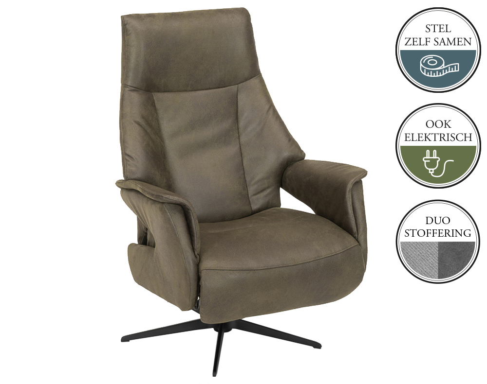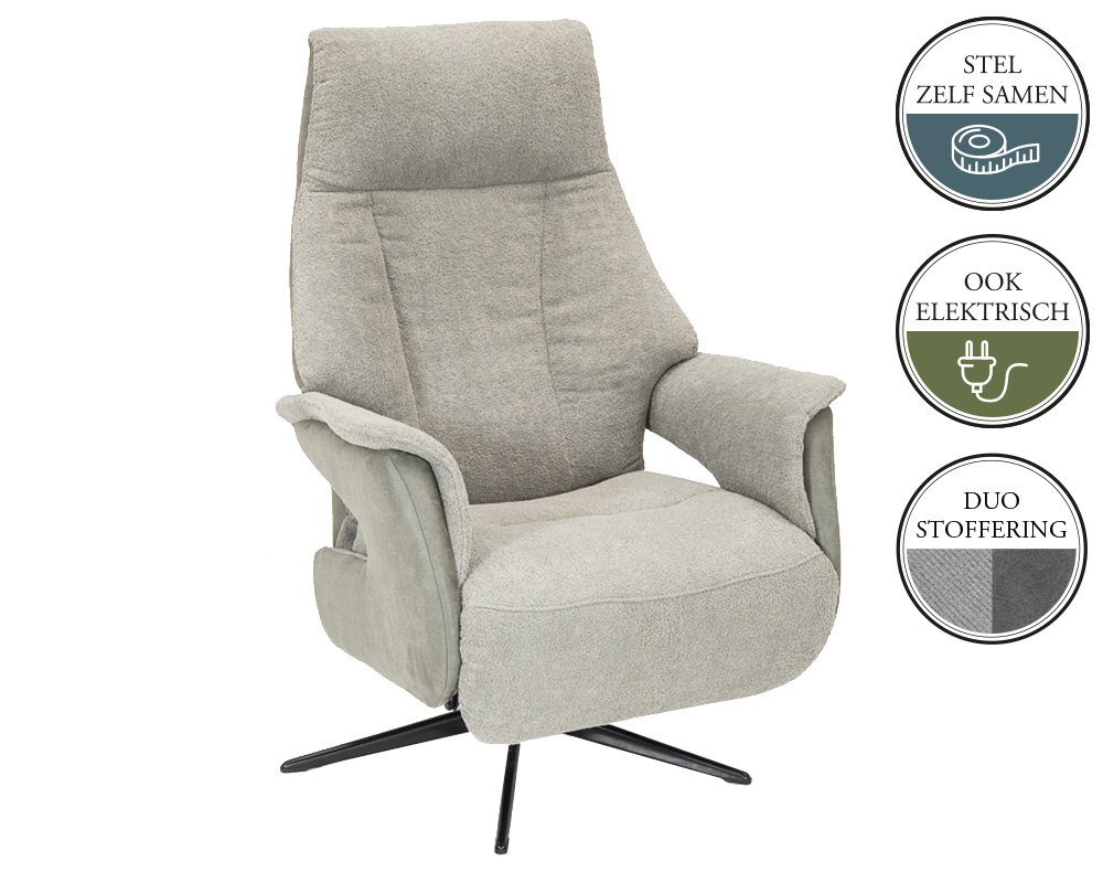 Deze relaxfauteuil is zowel manueel als elektrisch verstelbaar mogelijk. Mocht je voor de elektrische variant kiezen dan er een accu leverbaar. Als je een accu bestelt, dan wordt de fauteuil niet uitgevoerd met een snoer.