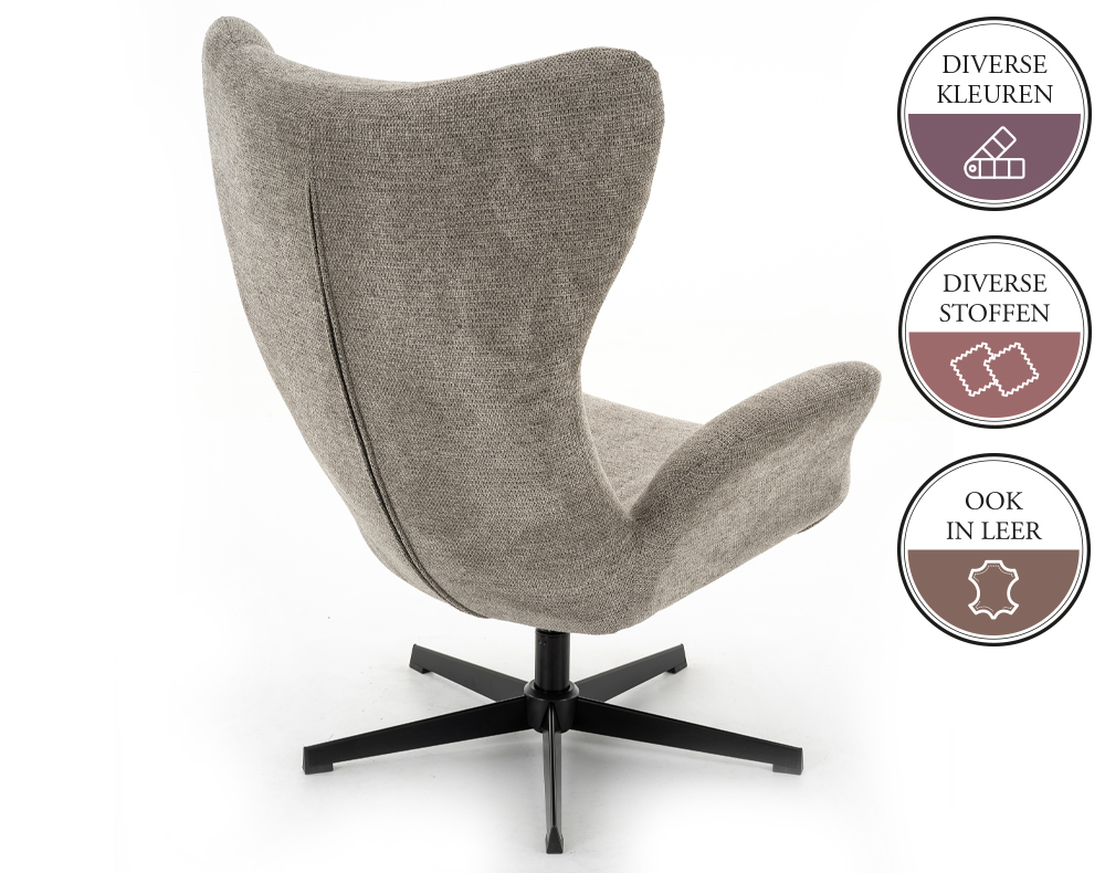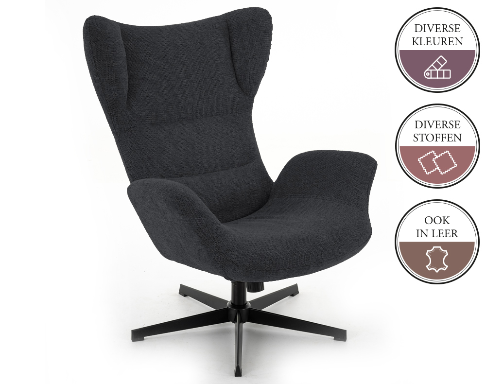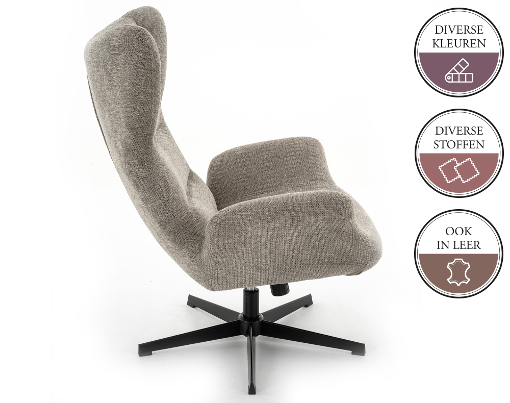 TANELI Draaifauteuil te verkrijgen in alerlei verschillende stoffen, leerkwaliteiten of kleuren. TANELI is standaard uitgerust met een kantelfunctie waardoor je nog relaxter kan zitten!