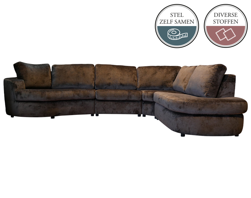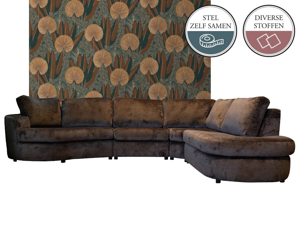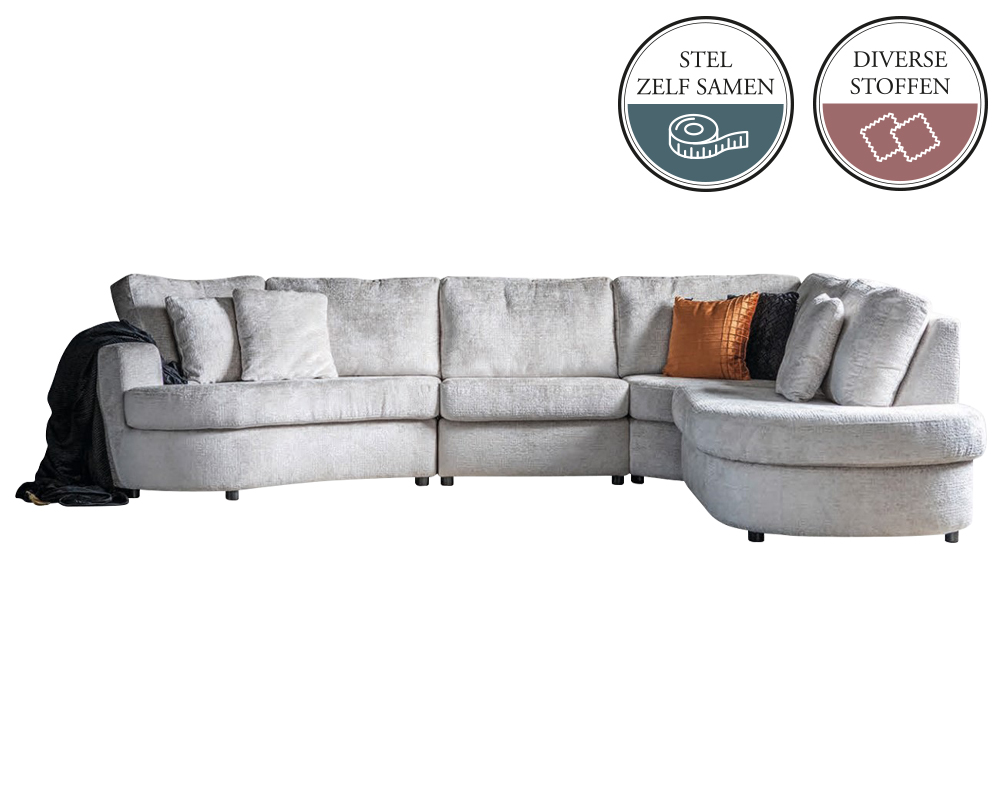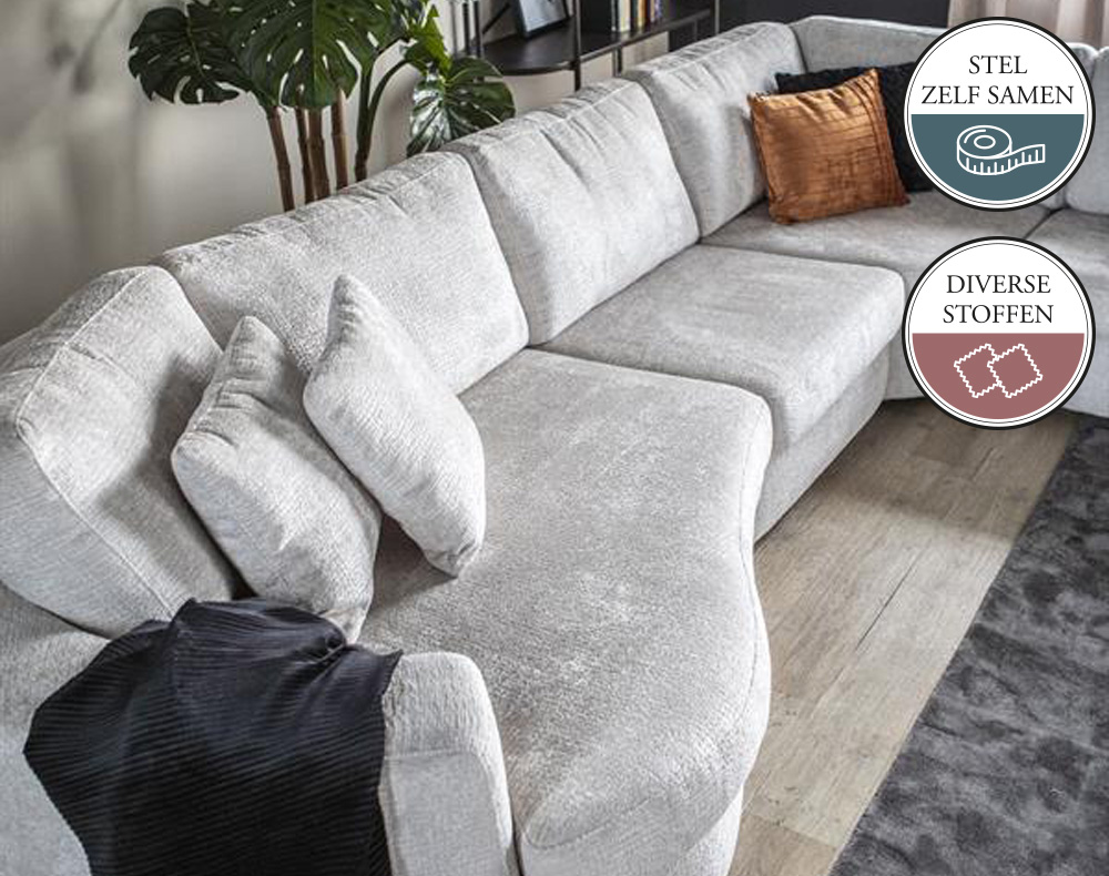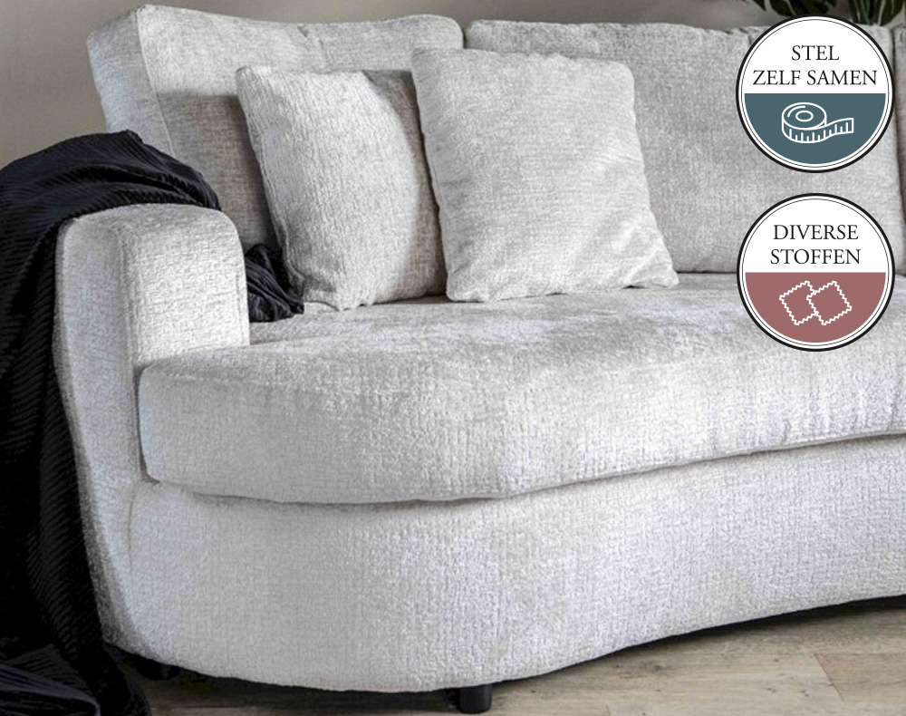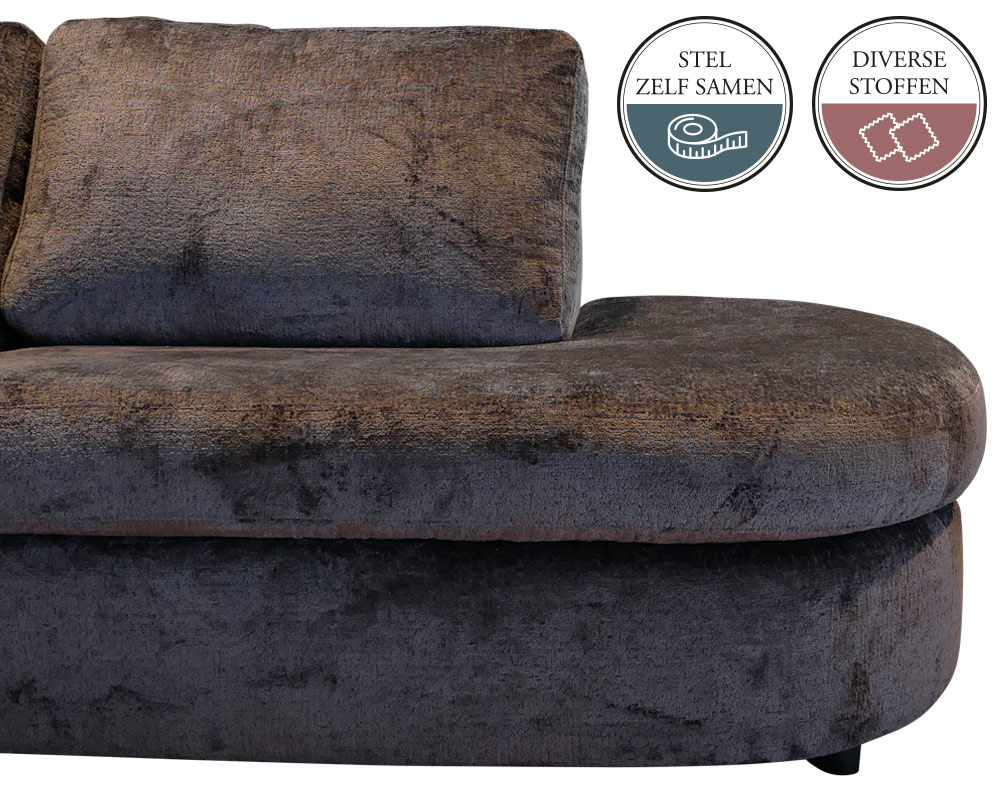 Dit zijn de onderdelen waarmee je je eigen bank samenstelt. Je combineert bijvoorbeeld een element met arm links met een ander element met arm rechts.